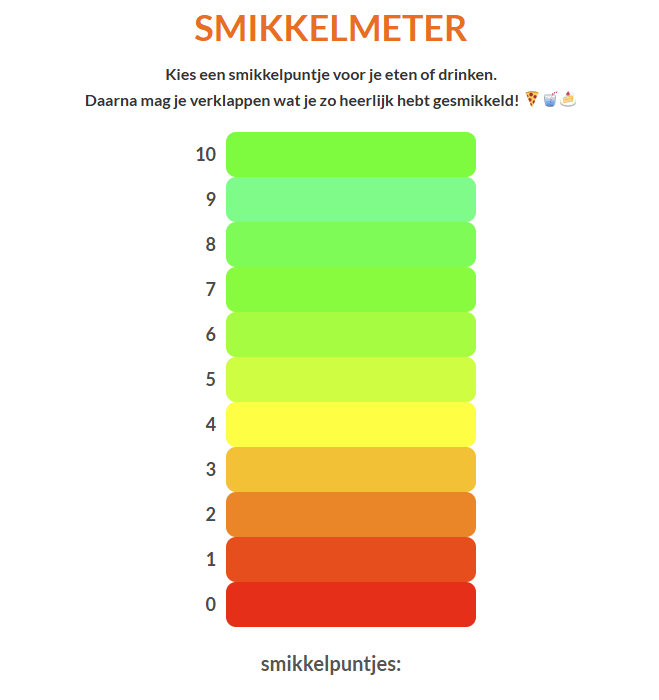 Op je site gebruik je de shortcode [smikkelmeter] om de Smikkelmeter zichtbaar te maken. Je bezoekers kiezen een cijfer en typen vervolgens een woord waarmee ze hun smikkelervaring delen. Dit wordt meteen zichtbaar in de woordwolk waar populaire woorden groter verschijnen. Het is simpel!