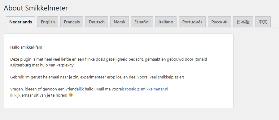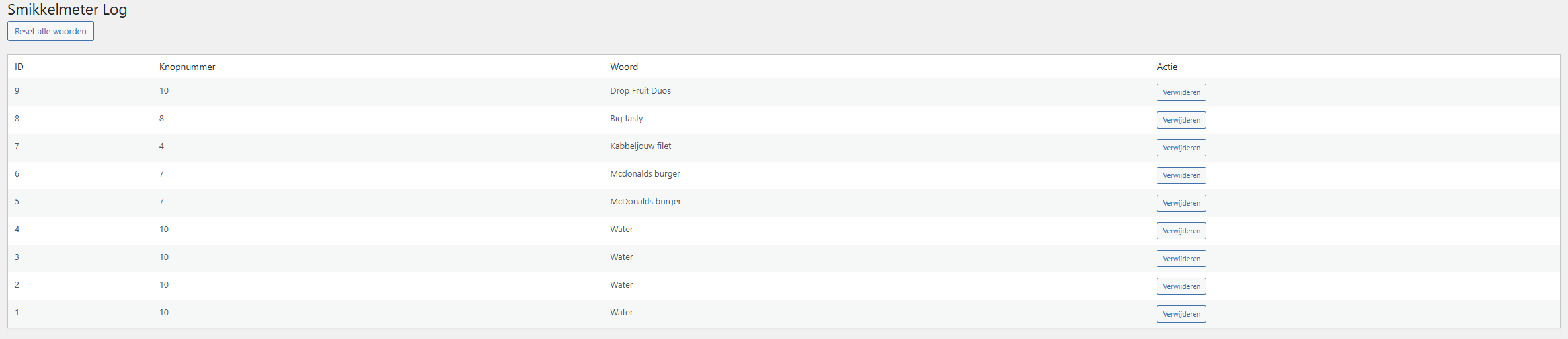 Je beheert alles vanuit het speciale adminmenu “Smikkelmeter” in je WordPress dashboard. Daar vind je de log met alle ingezonden woorden, kun je ze per stuk of in een keer allemaal verwijderen wanneer je wilt. Zo heb je altijd controle over je woordwolk-resultaten.